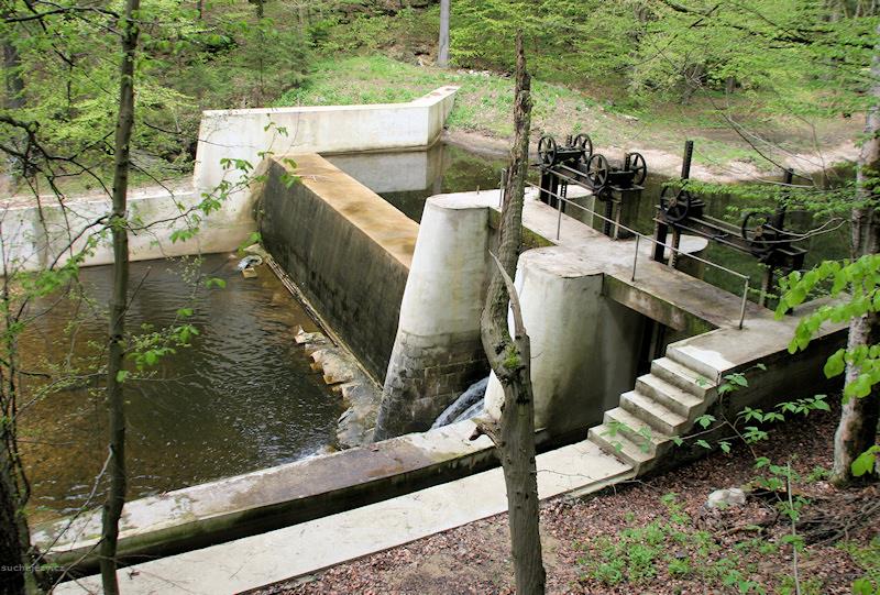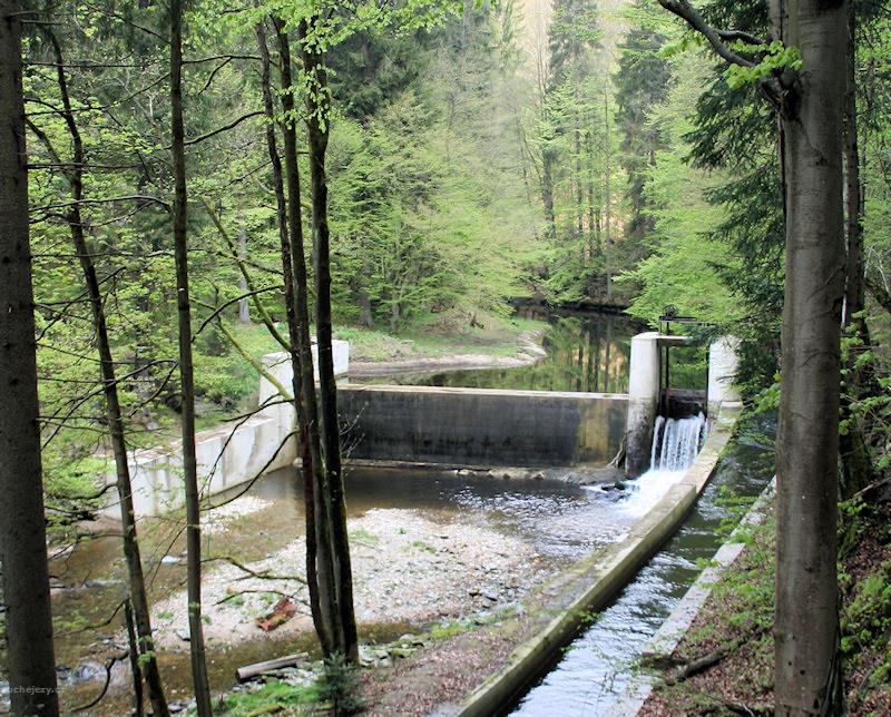 Nově opravený jez s dlouhým náhonem vlevo. Koruna jezu byla zcela suchá, převod menšího množství vody do podjezí byl zajištěn pod stavidlem.