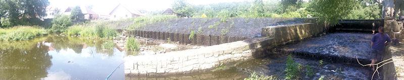 Šikmá přelivná plocha se zahrazenou propustí vlevo. Náhon je vpravo a zpět se vrací voda až po 300 m.