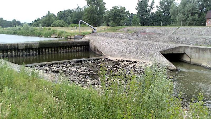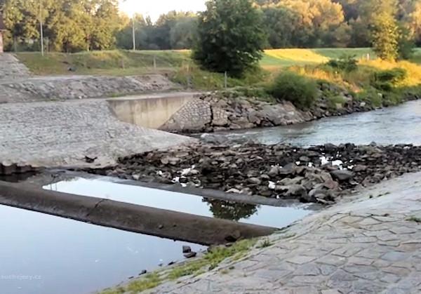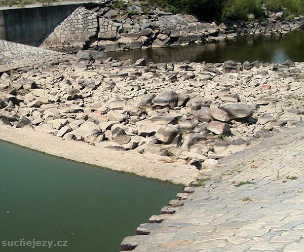 Většina vody protéká elektrárnou, přelivná plocha je zcela suchá. Voda se vrací cca 10 m pod jezem.