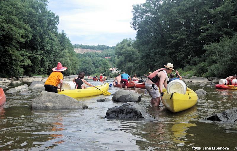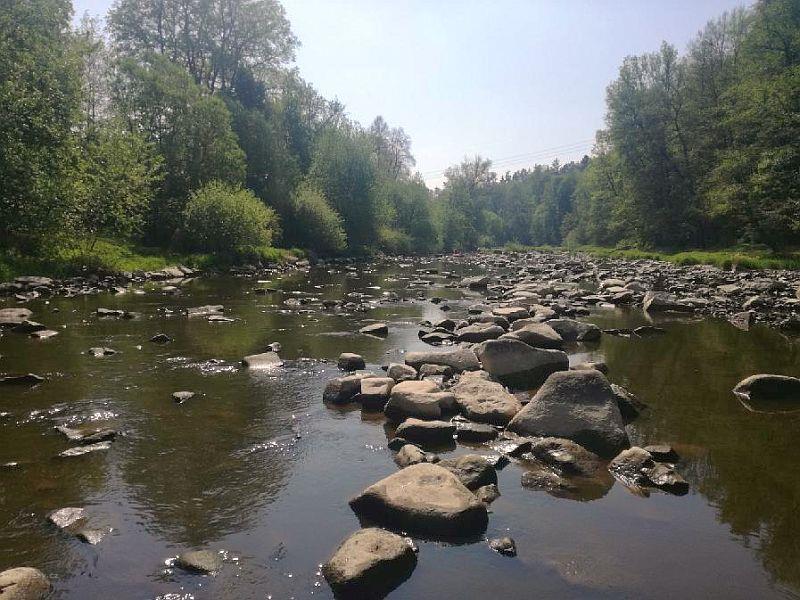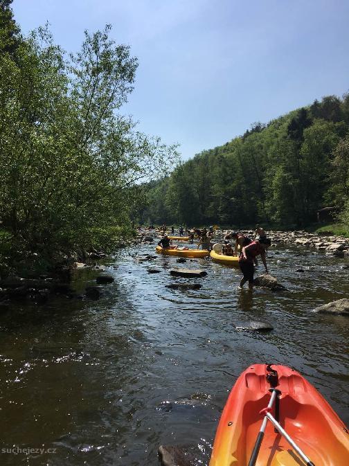 Přenášení jezu:Vpravo po břehu, pak obtížný průjezd cca 1 km po kamenech v řece