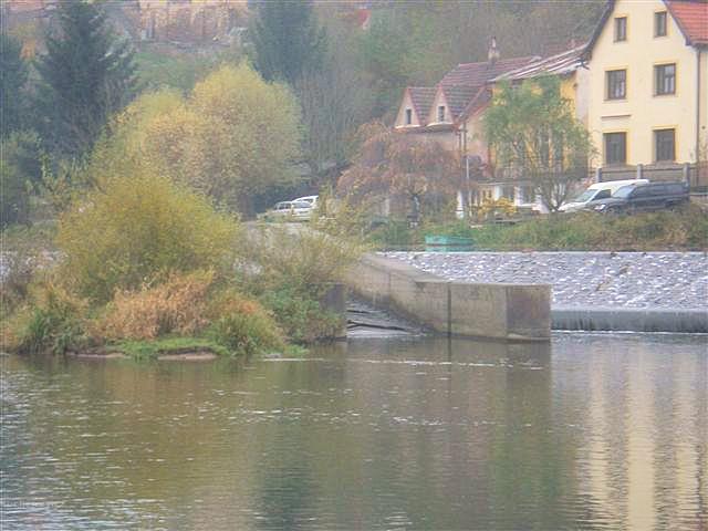 * celkové foto vorové propusti vyfotografované ze zdrže s pozadím okolí Kácova