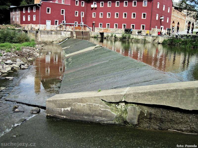 Jez dlouhý přes 115 m s širokou vorovou propustí uprostřed. Veškerá voda je svedena do náhonu. Přes pravou část jezu neteče za středních i nízkých stavů nic a propust je zcela zahrazena. Zanedbatelný paprsek vody teče přes levou část. Náhon se vrací ihned pod jezem.