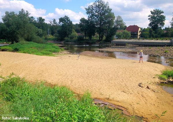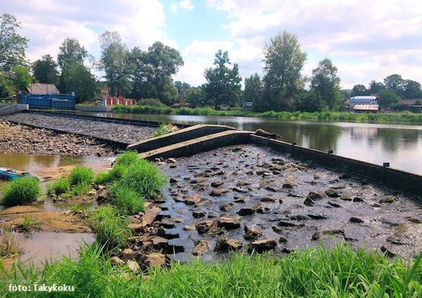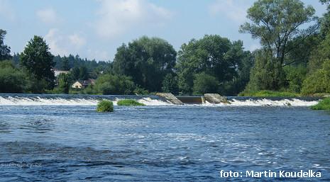 Přes suchý jez a následně přetáhnout broděním mělčiny nebo vlevo po louce