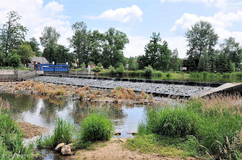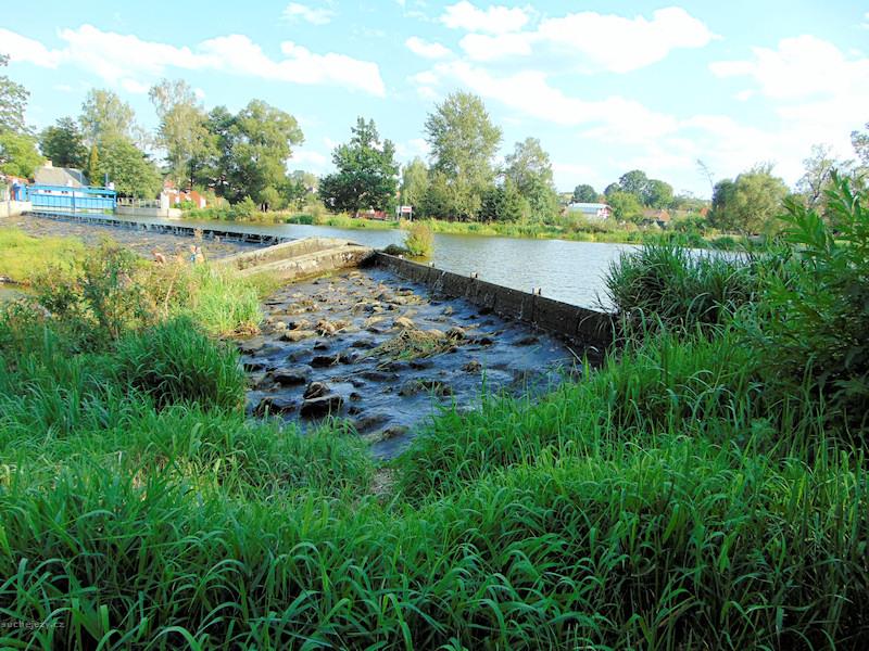 šikmý jez s propustí při levé straně, která ale bývá často uzavřená. Veškerou vodu odvádí náhon vpravo do elektrárny a vrací ji až po 150 m. Pod jezem je zhruba 80 m naprosté sucho, další část k vyústění náhona je s obtížemi průjezdná. MZP je stanoven jen ve výši 2,5 m3/s.